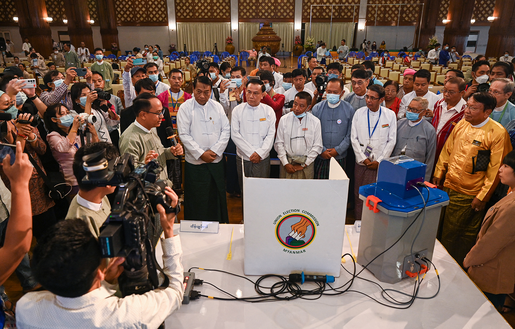 Members of Myanmar's Union Election Commission speak during a demonstration of voting machines to be used in future elections in Yangon on Sept. 5, 2023. / AFP