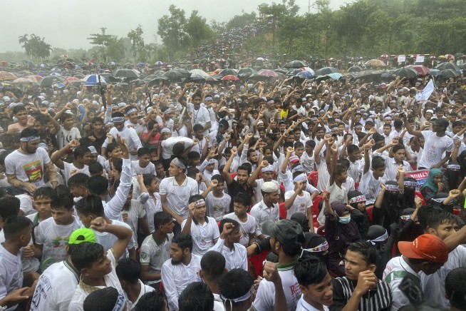 Hundreds of Rohingyas gather in the rain to demand safe return to Myanmar’s Rakhine state as they mark the seventh anniversary of their mass exodus from Myanmar at their refugee camp at Kutupalong in Cox’s Bazar district, Bangladesh in August 2024. (AP Photo/ Shafiqur Rahman)